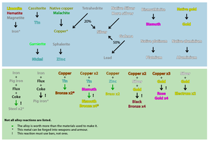 - Реакция показывает базовую рецептуру без учёта топлива, которое может не понадобиться после открытия магмы. Альтернативные ингредиенты можно посмотреть в статьях про сами сплавы либо в стать про выплавку.