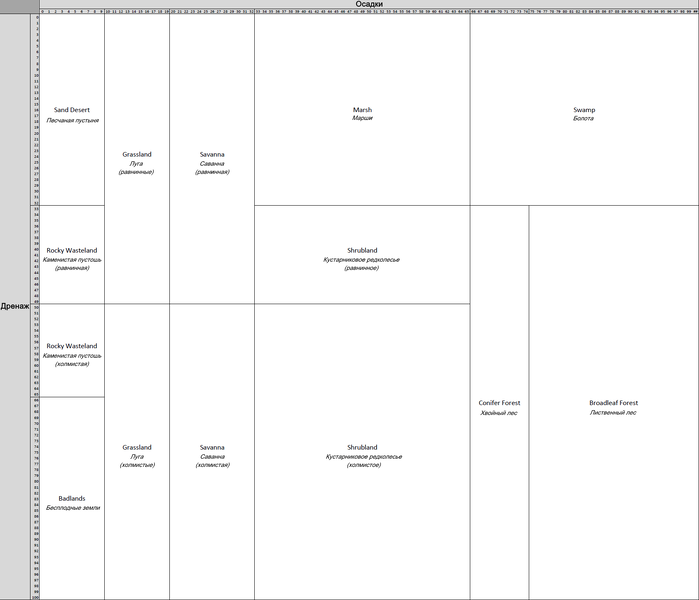 При определении биома на первом месте стоит высота над уровнем моря; любая местность с отметкой 0-99 баллов — это океан, в то время как любая местность с отметкой 300-400 баллов — это горы. Все остальные биомы находятся между этими двумя крайностями. Остальные базовые биомы определяются сочетанием дренажа и осадков.