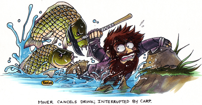 Карпы весят почти только же, сколько и взрослый дварф, но совершенно безобидны, и, будучи водными, они никогда не атакуют гражданских по своей воле. Хотя в былые времена карпы были свирепыми, сегодня они будут охвачены страхом при виде рыболова и могут послужить мишенью для ваших охотников. Однако, неживые карпы — это совершенно другая история. Карпы обладают неиспользуемой ценностью питомца в 50, но, как и большинство рыб, совершенно не поддаются дрессировке.